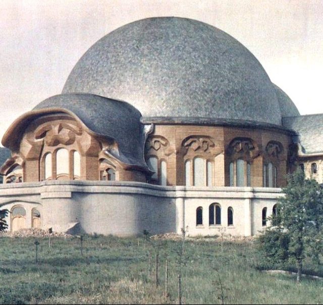 Il primo Goetheanum (denominato Johannesbau – edificio di Giovanni), ideato da Rudolf Steiner e costruito in legno, venne completamente distrutto in un incendio doloso da ignoti avversari dell’Antroposofia il 31 dicembre del 1922 a Dornach, presso Basilea in Svizzera.