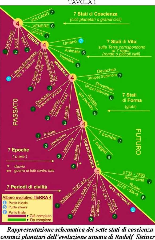 Non è facile dunque orientarsi in questi concetti molto complicati della natura superiore spirituale dell’uomo, se non dopo un approfondito studio metodico e riflessivo della conoscenza antroposofica data dalla Scienza dello Spirito. I quali se compresi nella loro essenza spirituale, ci fanno capire che l’uomo si manifesta attraverso diverse dimensioni cosmiche fino alla sfera spirituale del “Logos”, vale a dire quella sfera spirituale superiore da dove fu accolto dagli Elohim solari come dono dalla Trinità divina, la pura essenza spirituale del Vero Io o Scintilla divina32 quale vero “nocciolo” della natura divina spirituale dell’uomo superiore. Non dobbiamo pertanto concepire il nostro Sé superiore come un autocrate bizzarro cui piace godere dall’alto, della nostra sofferenza umana, tutt’altro! Egli è un’entità colma d’amore, poiché concepito e generato dall’amore divino. Ma è un amore divino cui non può fare altro per il momento, che volgerlo verso il figlio umano imperfetto, se mi è permesso dire, con severità! per il fatto di dover guardare costantemente in avanti verso il futuro “Uomo spirituale” perfetto che va realizzato. Esso fu concepito sull’antico Saturno da Dio Padre, tramite la collaborazione dei Troni o Spiriti della Volontà, i quali donarono all’uomo una parte del loro “fuoco divino” quale principio inferiore del corpo fisico (corpo di calore o Fantoma) e il germe spirituale del principio superiore dell’Uomo Spirito o Atma, cui l’Io umano, è portato a sviluppare e realizzare quale scopo della sua meta futura alla fine del lontanissimo stato di coscienza di Vulcano. Questo vuol dire che la nostra Terra, finito il suo ciclo terrestre (che richiede ancora moltissimi millenni), dovrà attraversare tramite un processo d’incarnazioni o metamorfosi cosmiche, ancora tre successivi stati di materia più sottile spirituale, tre eoni o stati di coscienza cosmici che la Scienza antroposofica chiama Giove, Venere e Vulcano.33 Pertanto, non possiamo aspettarci da lui nessuno sconto, tutto deve essere consumato e compensato attraverso prove, dolori e sofferenze della vita che noi stessi, d’altronde, abbiamo deciso di sopportare prima della nostra nascita, ossia prima d’incarnarci e che non ricordiamo più grazie al velo che il nostro Angelo custode stende sulla nostra memoria.