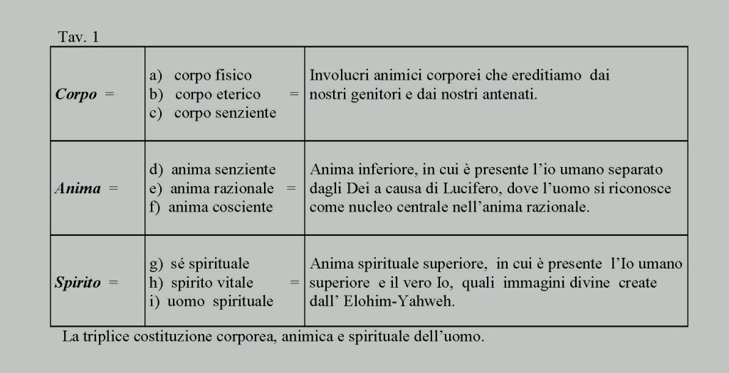 Per capire quest’aspetto occorre avere ben presente la costituzione della natura corporea, animica e spirituale dell’uomo, che per meglio capire le parole di Rudolf Steiner, diamo una sintesi schematica nelle tavole seguenti così come descritta in Teosofia. Come possiamo vedere dalle due tabelle che seguono, l’uomo è formato da un “Corpo” cui viene diviso a sua volta in “corpo fisico, corpo eterico e corpo senziente”, che sono quelli che ereditiamo dai genitori e dai nostri antenati. Siamo poi formati da un’”Anima” dove l’Io inferiore ha lavorato per diverso tempo in modo incosciente, per perfezionare e organizzare il corpo astrale in anima senziente, anima razionale e anima cosciente. Pertanto, è attualmente cosciente solo nell’anima razionale, la quale forma il nucleo dell’io terreno e dove l’uomo si autoconosce come “coscienza dell’io”. Attraverso questa coscienza dell’io, chi in modo incosciente e chi tramite un lavoro esoterico più cosciente, l’io umano lavora allo sviluppo dell’anima cosciente, purificando e perfezionando maggiormente il corpo astrale dalle brame, dai desideri, dalle passioni, e particolarmente dal proprio egoismo, giacché l’anima cosciente rappresenta la sintesi, la parte più pura ed elevata del nocciolo inferiore umano. Essa difatti, è strettamente congiunta al Sé spirituale ed è quella parte che appunto il Cristo generò come “Figlio dell’uomo” in Gesù di Nazareth, durante il battesimo di Giovanni. Inoltre, vediamo che l’uomo è formato da uno “Spirito” che a sua volta Rudolf Steiner divide in Sé spirituale (Manas), spirito Vitale (Buddhi) e Uomo spirito (Atma); cui l’Io superiore è presente nel “sé spirituale”, da dove opera attraverso l’anima cosciente e quindi inconsciamente guida l’uomo inferiore verso il suo destino karmico.
