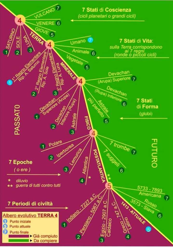 Aiutandoci con l’immagine schematica della Tav.1 elaborata e tratta dal libro “Apocalisse” O.O. n. 104 (Ed. Antroposofica Milano), si può vedere lo sviluppo dei “Sette Stati di coscienza comici”, possiamo vedere che ora siamo nel quarto stato di coscienza o eone terrestre che chiamiamo “Terra”, e dopo aver attraversato tre regni elementari o stati di vita, siamo ora nel quarto stato di vita chiamato minerale. Questo vuol dire che l’uomo prima dello stato di vita del minerale attuale, è passato attraverso degli stati di vita in cui il minerale era in uno stato più sottile. Pensiamo a un pezzo di ferro cui lo scaldiamo fino a scioglierlo e farlo diventare liquido e scaldandolo ancora lo facciamo vaporizzare fino a che non vediamo più nulla, ossia fino a spiritualizzarlo cui non vi è più traccia nel fisico; ciò è quello che s’intende per terzo regno elementare, Nel regno minerale dobbiamo attraversare sette stati di forma, per cui ne abbiamo attraversati già tre, cioè lo stato di forma senza forma del Devachan superiore, quello in una forma sottile del Devachan inferiore e quello di una forma più densa del mondo astrale, per cui ora siamo nel quarto stato di forma chiamato fisico. In questo stato di forma fisico dobbiamo attraversare sette Epoche, di cui abbiamo attraversate già quattro, cioè l’Epoca Polare, l’Epoca Iperborea, l’Epoca Lemurica e l’Epoca Atlantica, ora siamo nella quinta Epoca Postatlantica.
