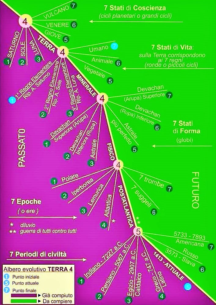 6 Sappiamo dalla Scienza dello Spirito che l’uomo per compiere la sua meta deve passare attraverso sette stati di coscienza planetari particolarmente complessi che chiamiamo: “Saturno, Sole, Luna, Terra, Giove, Venere e Vulcano”; di cui ogni stato di coscienza attraversa sette stati di vita e ogni stato di vita sette stati di forma. Occorre ancora suddividere ogni stato di forma in sette Epoche e infine ogni Epoca in sette periodi di cultura. Ora tralasciando gli stati di coscienza, di vita e di forma già attraversati, siamo nel quarto stato di coscienza (Terra), nel quarto stato di vita (minerale), nel quarto stato di forma (fisico), nella quinta Epoca Postatlantica e nel quinto periodo di cultura, chiamato anglo-germanico che durerà circa 2160 anni. Dopodiché entreremo nel sesto periodo di cultura slavo-russo, infine nel settimo periodo di cultura americano cui terminerà con una catastrofe chiamata “la guerra di tutti contro tutti”. Vedi lo schema della Tav.1 qui sotto.